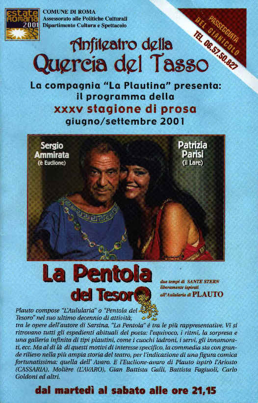 antiarte allo stato puro. Gli faccio rilevare le continue rotture della quarta parete attuate con dialoghi improvvisi col pubblico o col richiamare gli attori al fatto che stanno recitando una parte. Mi ricorda che in nuce la tecnica era presente in Plauto, non nell'Aulularia ma in altre opere in cui fa riferimenti improvvisi ad esempio all'impresario. Rivela Ammirata che la chiave prima del comico è innescare improvvisi dialoghi diretti col pubblico, come si soleva fare nella commedia dell'arte italiana, di cui lui è maestro. Ammirata ha svolto con La Pentola del Tesoro (due tempi di Sante Stern liberamente ispirati a Plauto) un lavoro accurato, armonico, agréable adattando lo spirito di Plauto che gli sta dentro nei precordi ai tempi del nostro vivere. E' un'altra lezione antiartistica che predica l'impredicabilità della ricostruzione dell'opera, della comicità e del dramma, secondo canoni rigorosi dell'epoca in cui fu scritta. Dramma e comicità richiedono background che validi in un tempo, non funzionano affatto in un altro. Per questo Ammirata non solo rompe la quarta parete ma entra in quinta dimensione là dove colora l'Aulularia con espressioni e modalità narrative proprie dei tempi successivi a quelli plautini. Così usa per la vecchia serva ubriacona Stafila la parola postrinascimentale "machiavellica", per una baldoria utilizza l'espressione "da cafè chantant" ma soprattutto crea una sequenza cinematografica con tanto di moviola a ritroso per l'entrata in scena di Lupetto(Francesco Querci) che vuole ammazzare lo zio Megadoro(un calibratissimo Mauro Bisso) invaghitosi fino a volerla sposare di Fedra, figlia di Euclione messa incinta proprio da Lupetto nelle inebbrianti feste di Cerere. Chi è il regista? Ma il Lare, naturalmente, anzi la Lare interpretata magistralmente da Patrizia Parise che svela la mutatio del genio da maschio a femmina a seguito della nuova politica delle pari opportunità. Il nume tutelare della casa assume così funzione di regista provando la scena dell'assalto del giovane al vecchio poi rifacendola andare a ritroso perché troppo cruenta, coi personaggi che sono andati decisamente ultra petitum. Nella ricostruzione
